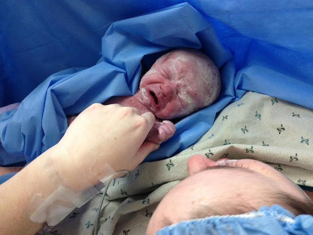 Next then I know, I heard her say it was time to get him out. She said I'd feel a little bit of pressure while they got him out and they weren't kidding. It seriously felt like a sumo wrestler jumped on my chest. It took all the breath out of me. but I could care less because next thing I know I hear a baby screaming and she lifted him up over the curtain for me to see (I have a picture but it's pretty nasty so I'll save Reuben's dignity and keep it off here haha). I had always imagined this crazy emotional moment of meeting him for the first time... and it was nothing like that. I laughed. I was just so happy he was here that I was laughing with joy! They wrapped him up and put him on my chest and I got my first good look at him. It was seriously love at first sight.